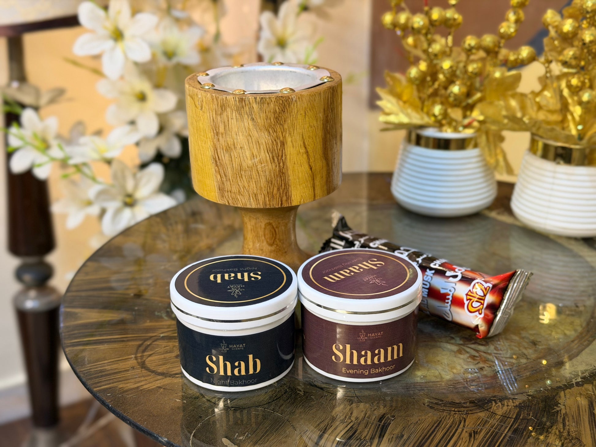 Wooden Bakhoor Burner Set with 2 Premium Bakhoors + Coals
